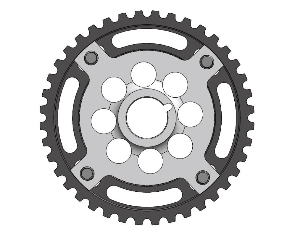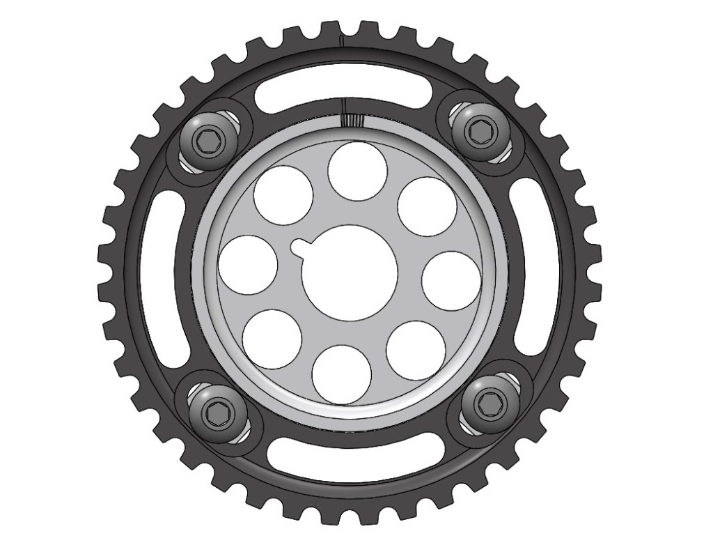Design of an adjustable camshaft gear for Porsche 2.5L 8V 944 engines. Allows for +/- 4° advance/retard of camshaft timing for fine tuning engine performance. Gear is designed out of 7075-T6 aluminum and hard-coat anodized.